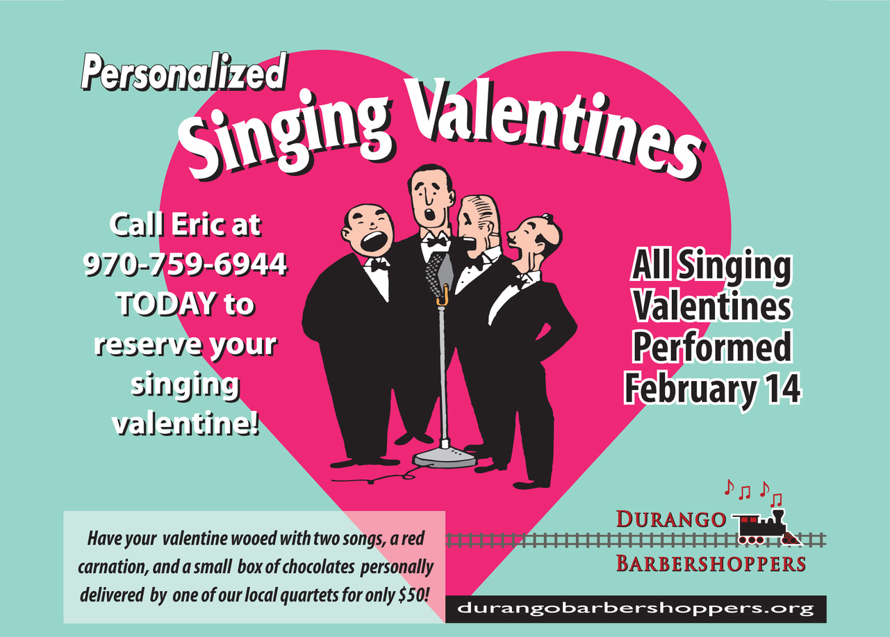 LOOKING FOR THAT PERFECT VALENTINES GIFT FOR THAT SPECIAL SOMEONE? HOW ABOUT A SINGING VALENTINE FROM THE DURANGO BARBERSHOPPERS! CALL ERIC TODAY AT 970-759-6944 TO SCHEDULE YOUR QUARTET TODAY. ONLY $50! ALL PROCEEDS GO TO SUPPORT DURANGO’S OLDEST MUSIC AND ARTS ORGANIZATION, CELEBRATING 58 YEARS. CREATE A MEMORY THEY’LL NEVER FORGET!